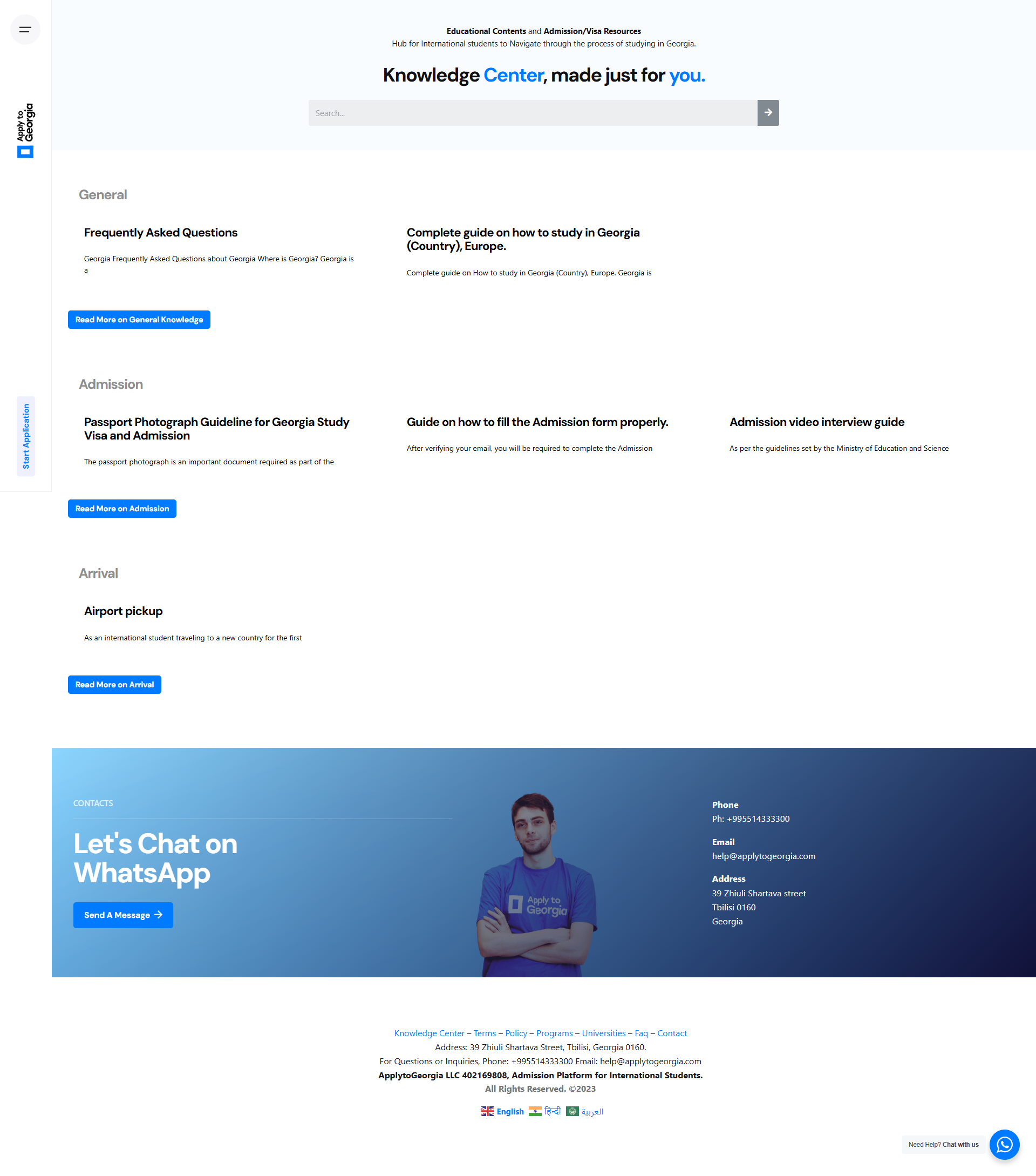 Included a Knowledge Center packed with FAQ guides, admission steps, passport and visa info, and arrival tips to inform users throughout the process.