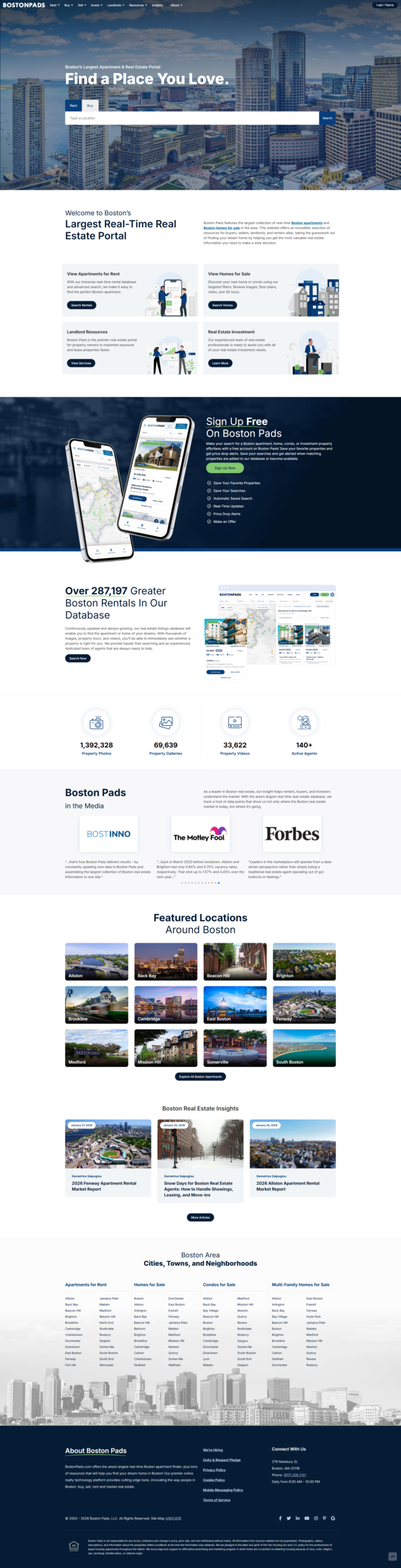 Boston Pads is designed as an advanced real estate search portal offering the largest real-time database of Boston and Massachusetts property listings — including apartments for rent, homes for sale, condos, and multi-family properties. The site serves both consumers and professionals by combining cutting-edge search functionality with up-to-date market insights and practical tools for property discovery and decision-making.
