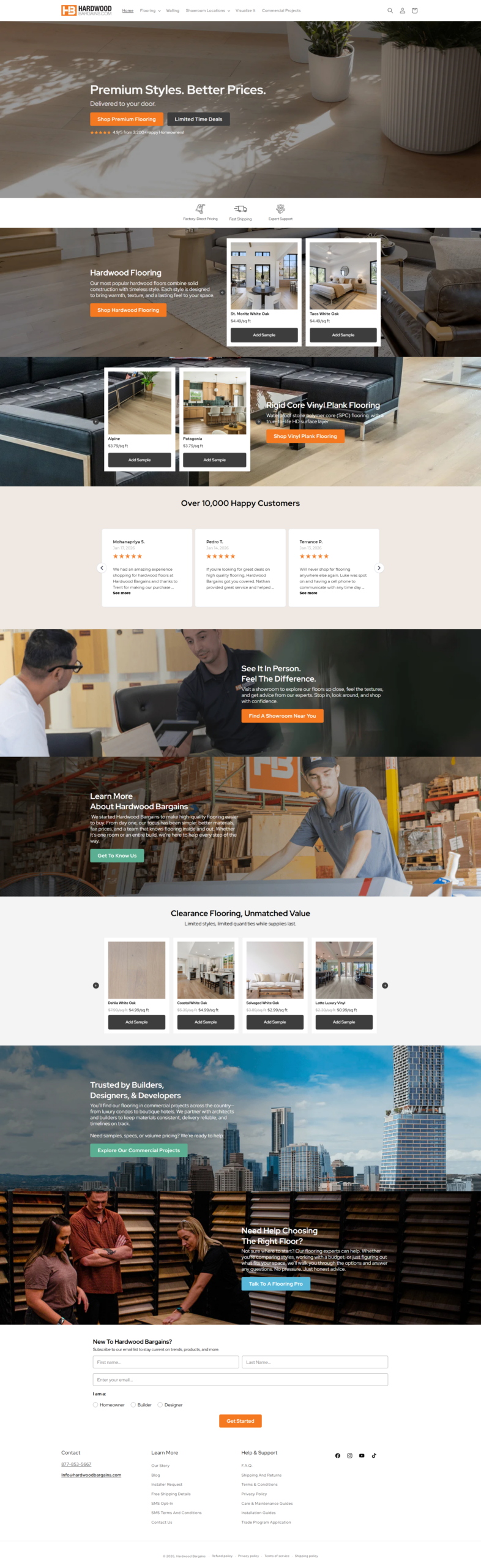 The Hardwood Bargains website was designed to support customers in finding and purchasing hardwood, engineered wood, and related surface products while also offering guidance on installation and maintenance. The platform functions as both an e-commerce showcase for flooring materials and an educational resource for choosing the right product based on budget, aesthetic, and performance requirements.