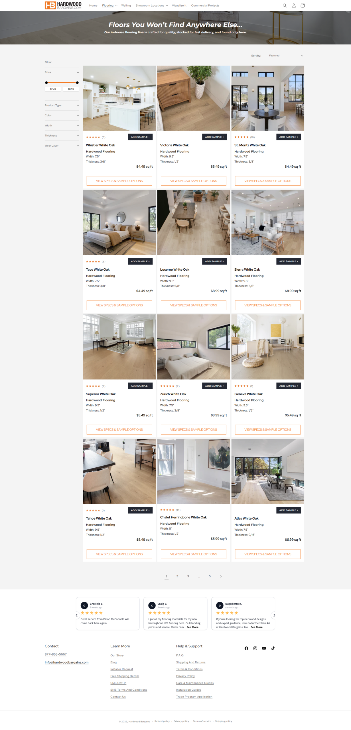 Organised the site into clear browsing paths — solid hardwood, engineered hardwood, accessories — with filters for species, finish, and price to help users find products quickly.