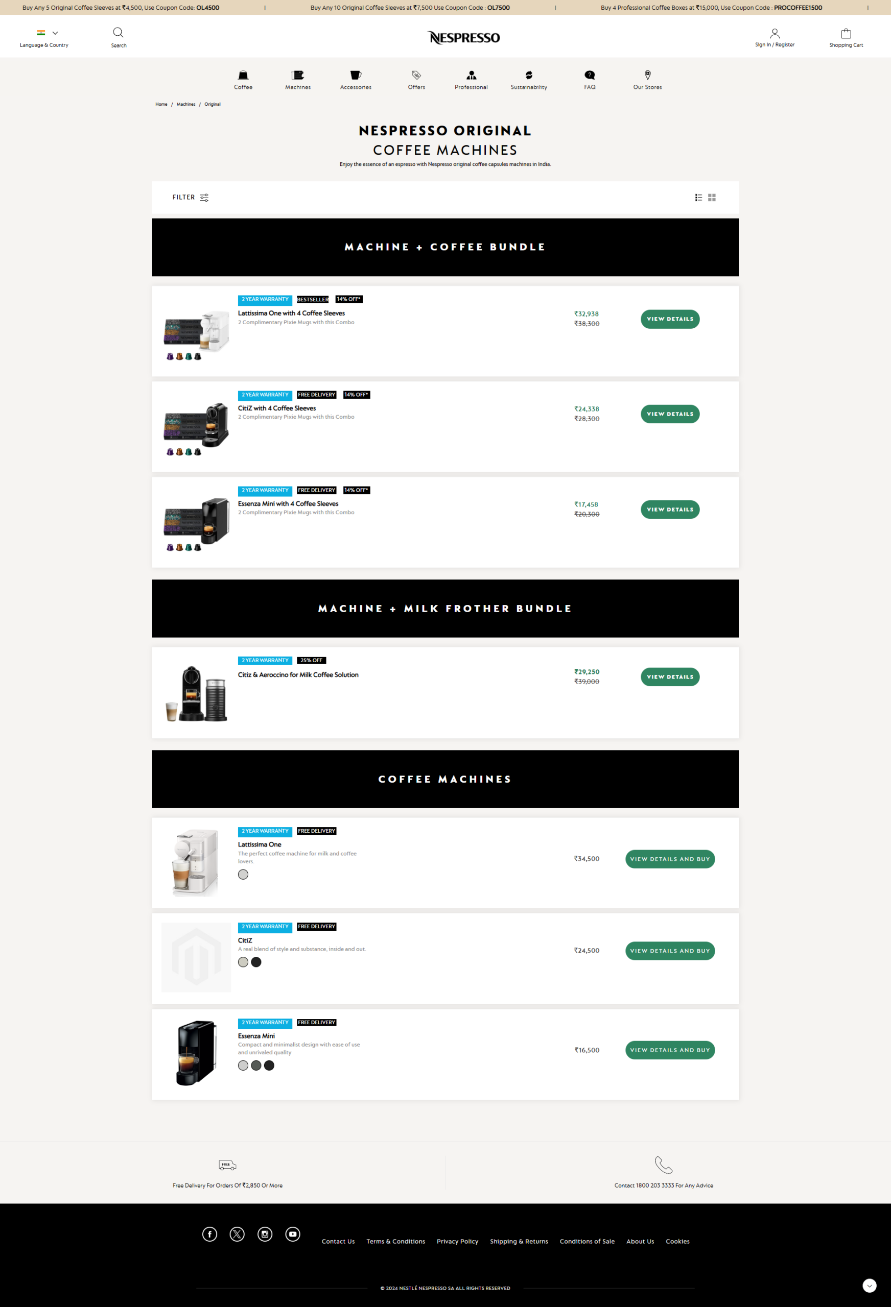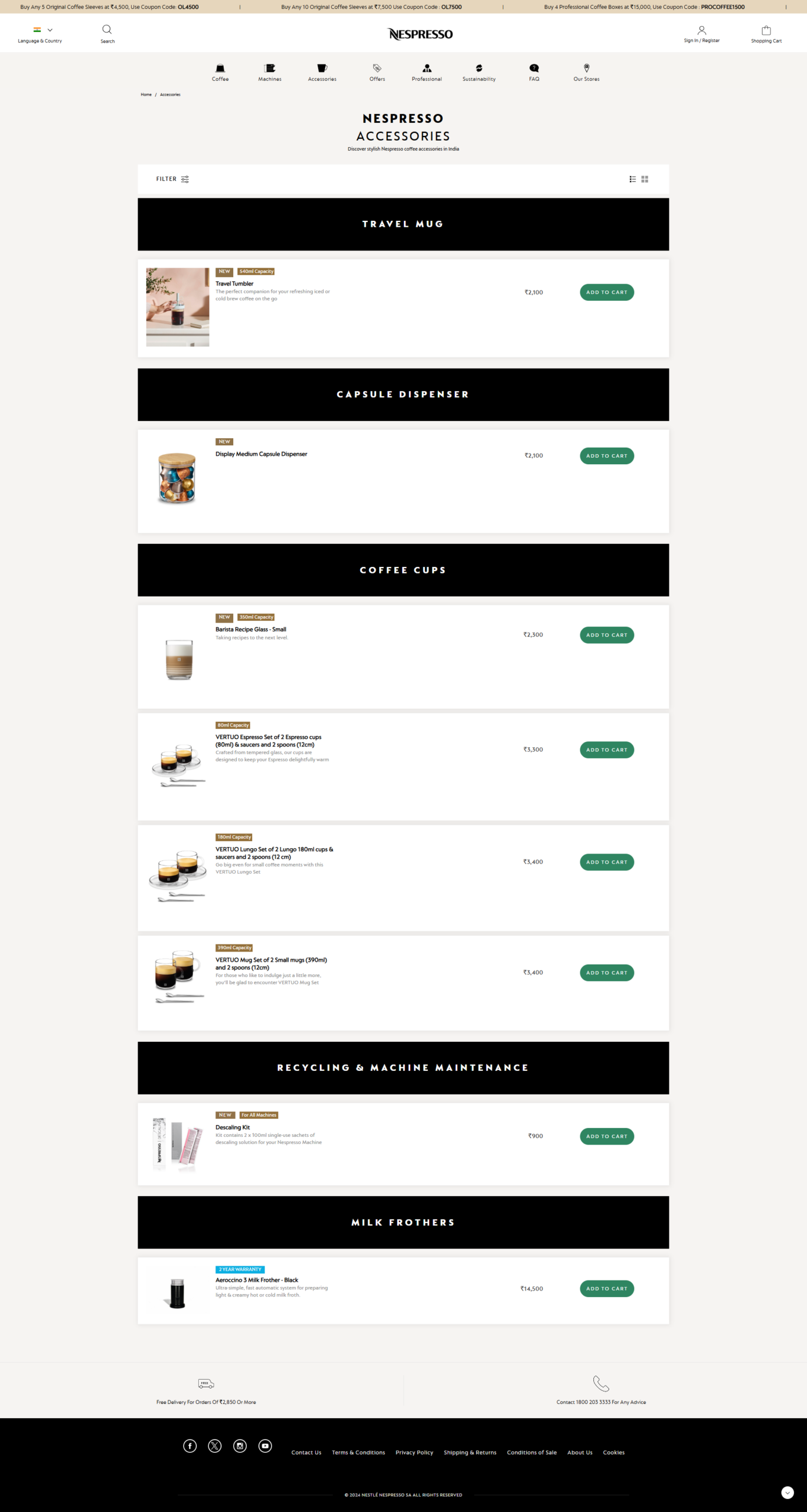 Nespresso India offers a premium selection of coffee capsules, espresso machines, and accessories, delivering an authentic café experience at home. Their range includes Original coffee capsules, machines like the Essenza Mini and CitiZ, and accessories such as milk frothers and capsule dispensers.