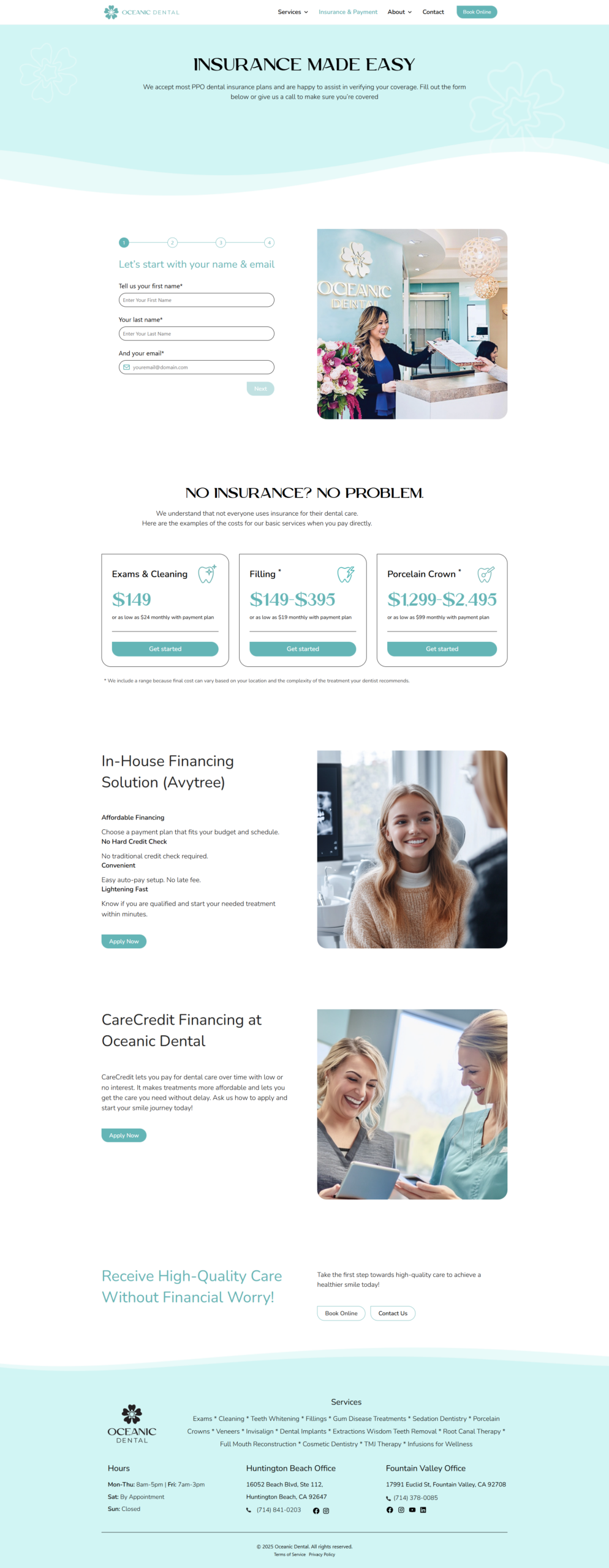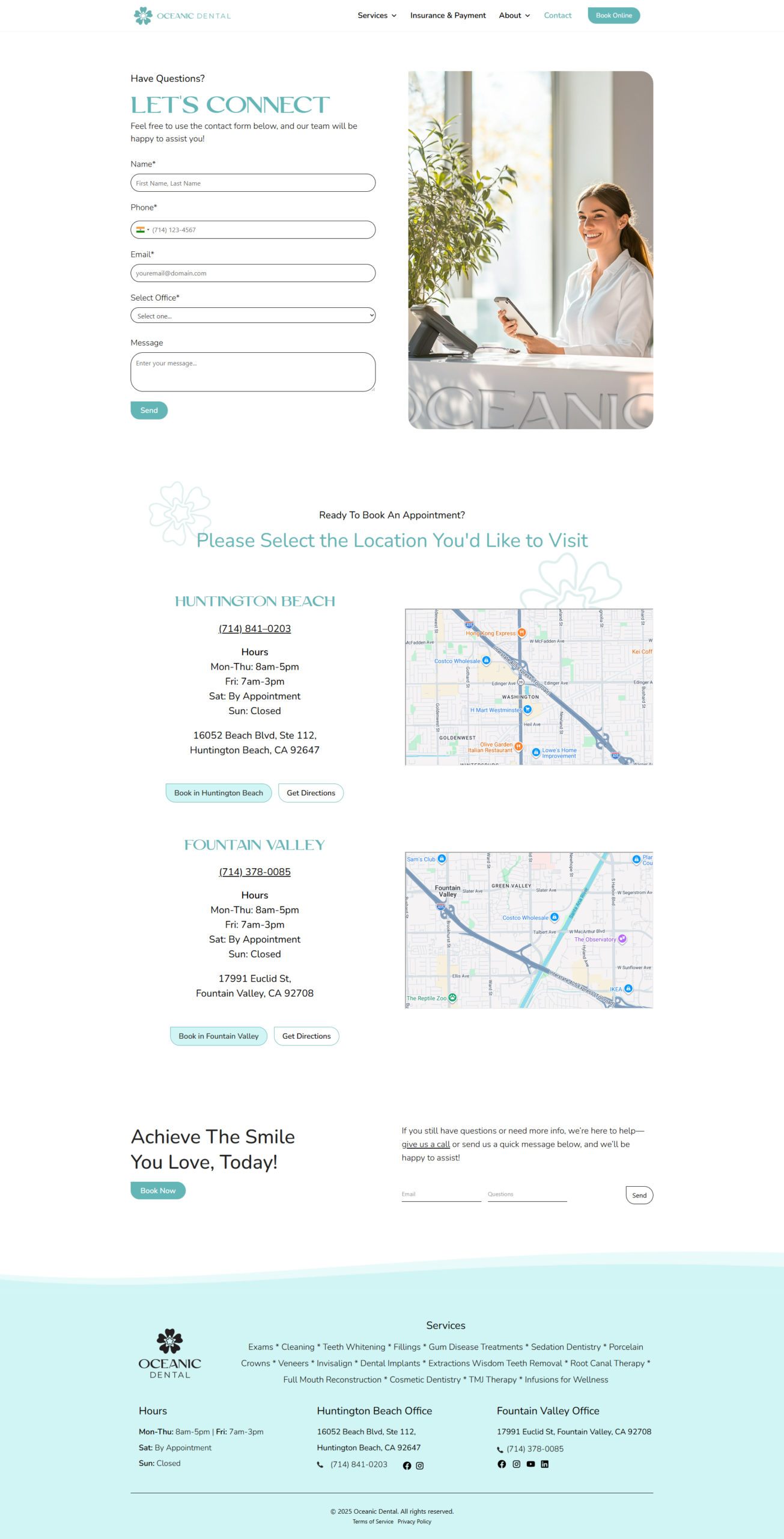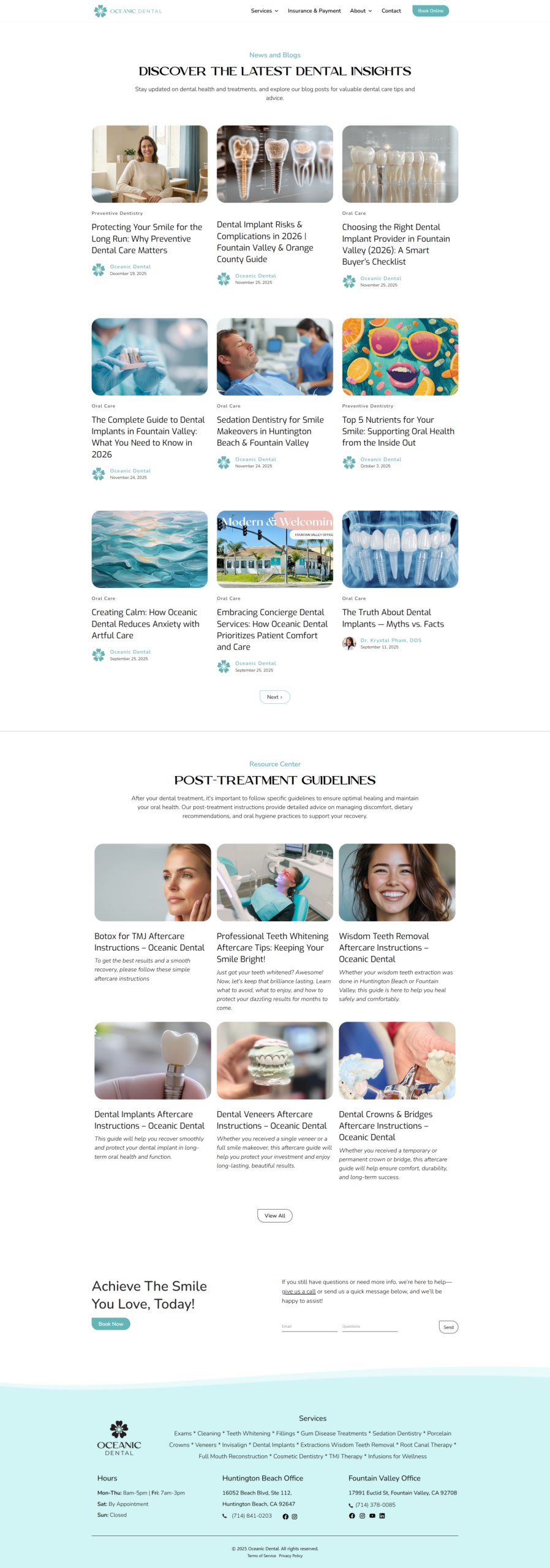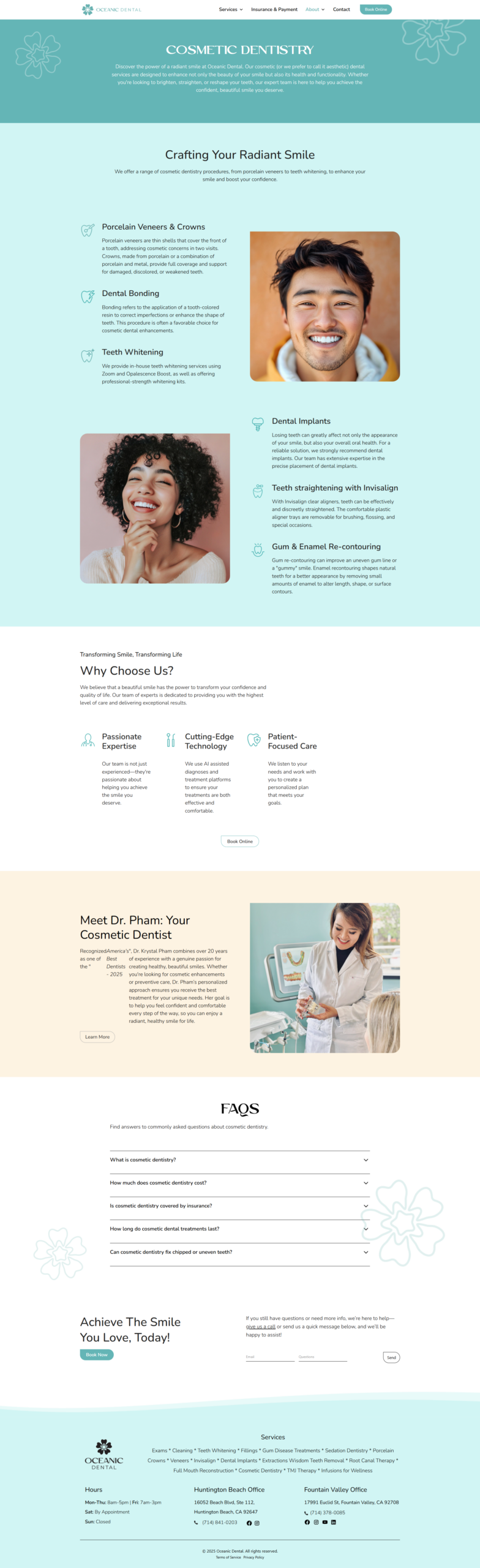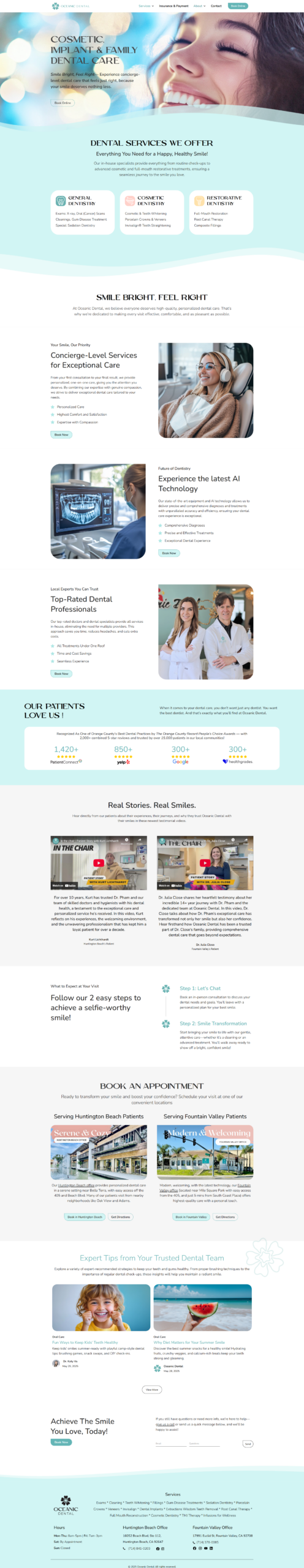 Oceanic Dental’s website was developed to present a full-service dental practice that delivers personalized, expert care in a comfortable, patient-focused environment. The objective was to showcase the practice’s broad scope of services — from routine check-ups and preventive care to advanced cosmetic procedures and full-mouth restorations — while reinforcing trust with clear messaging and easy lead capture.