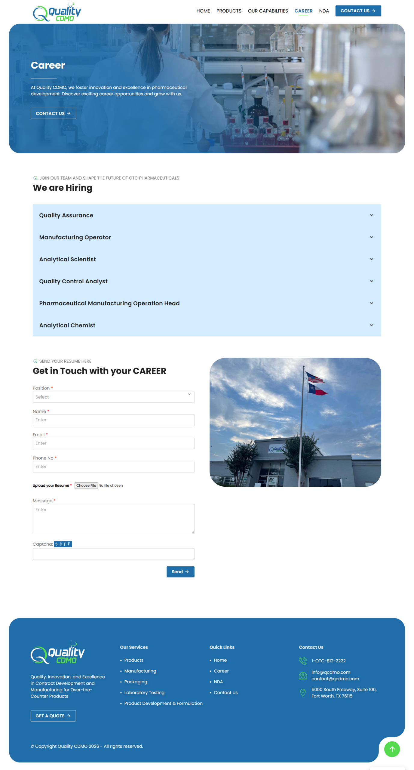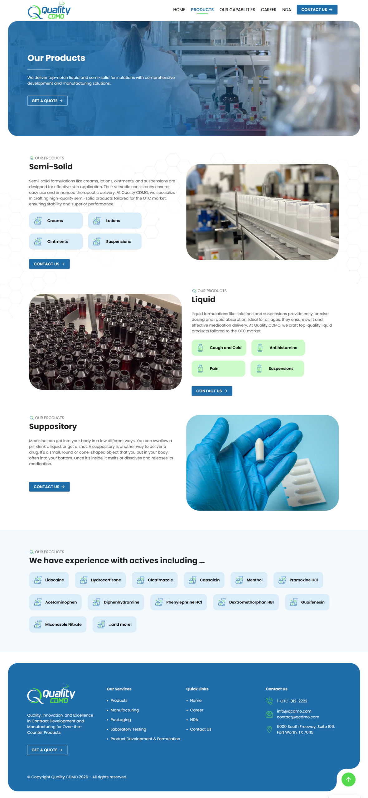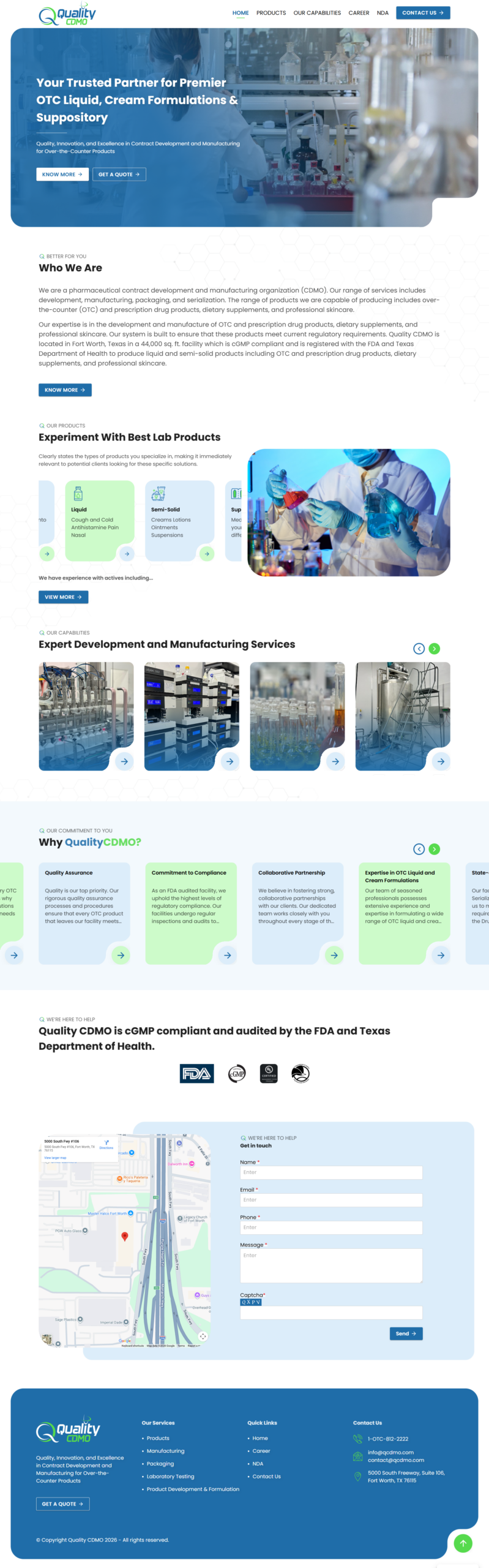 Quality CDMO’s website was created to present their comprehensive pharmaceutical contract services — including product development, formulation, manufacturing, packaging, testing, and quality assurance — to potential clients within the pharmaceutical and personal care industries.