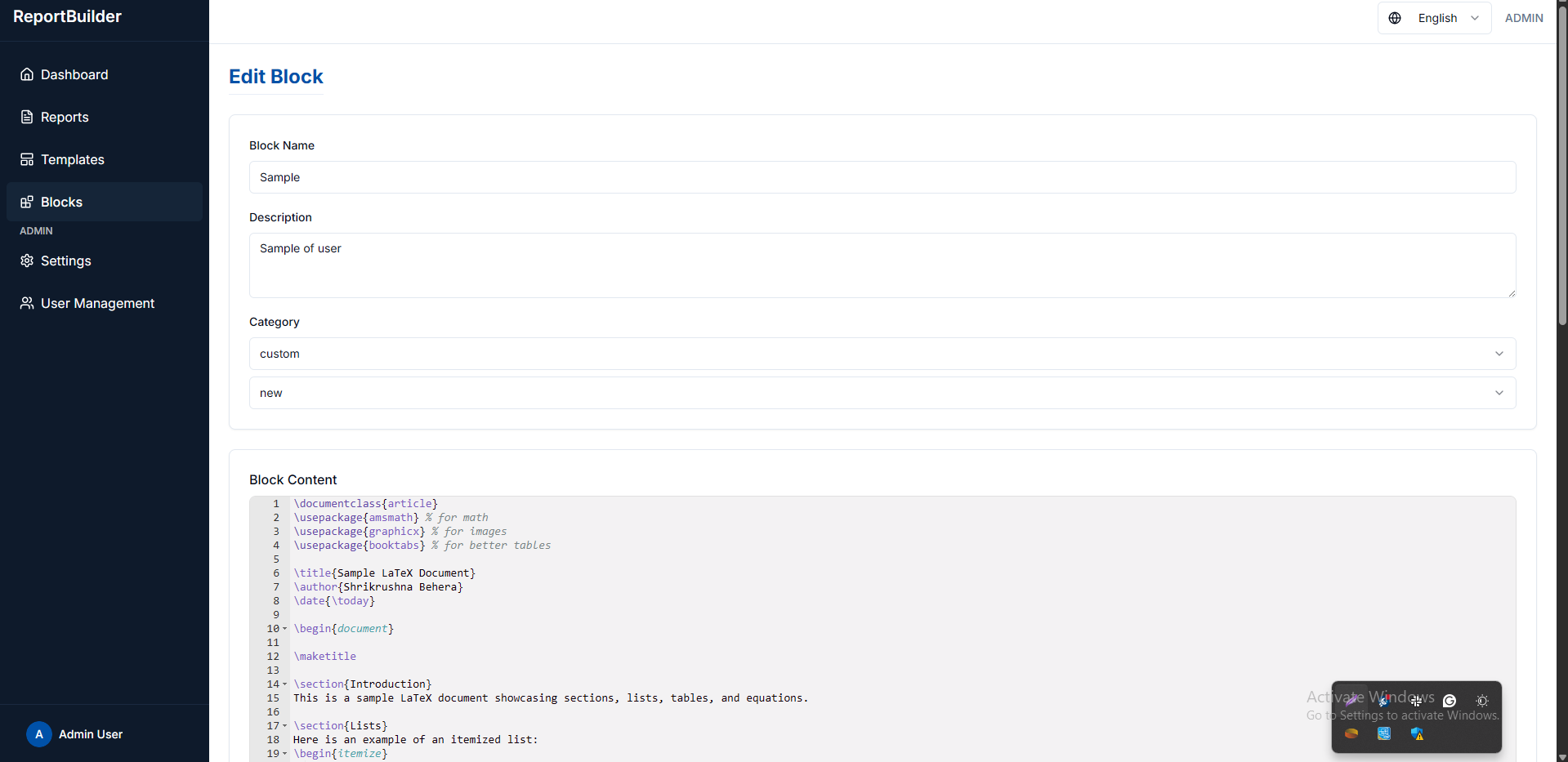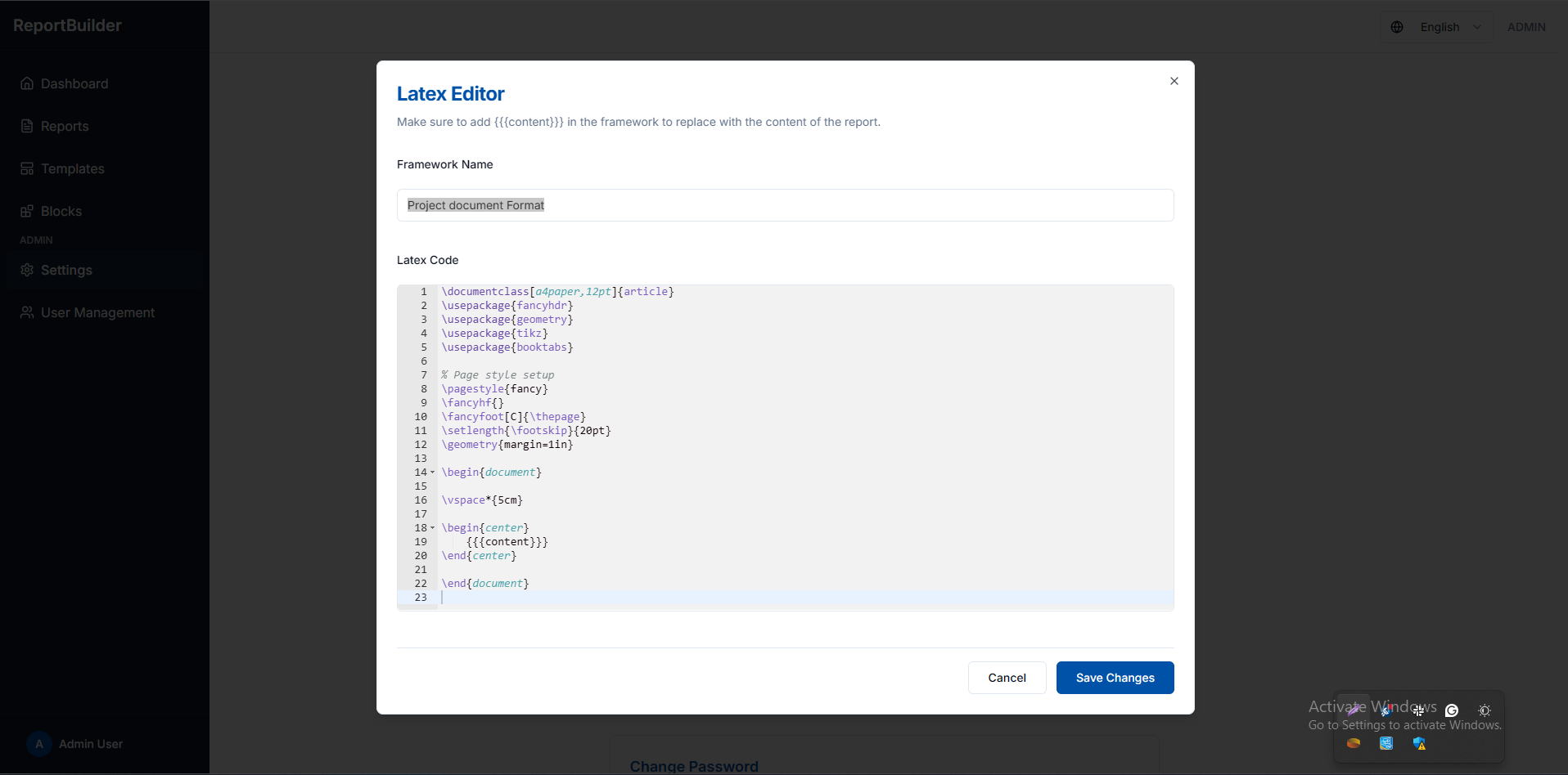 Report Builder is a dynamic document generation platform that enables users to create professional PDF reports using LaTeX through a structured and reusable workflow. The system allows users to define global LaTeX components such as headers and footers from a centralized settings panel, while composing the main document content independently. Users can create reusable LaTeX variables and modular content blocks, convert them into templates, and reuse them across multiple reports. The final output can be previewed in real time or exported as a high-quality PDF.